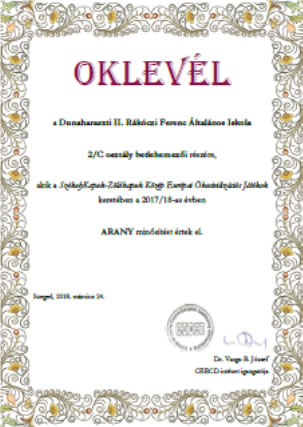 Oklevél a Dunaharaszti II. Rákóczi Ferenc Általános Iskola betlehemes csoportja részére, akik a SzékelyKapuk-ZöldKapuk Közép Európai Ökocivilizációs Játékok keretében a 2017/18-as tanévben ARANY minősítést értek el.