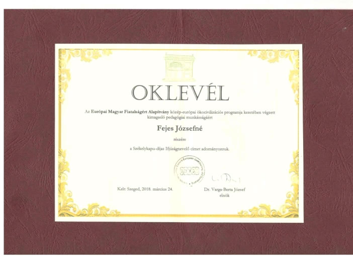 Az Európai Magyar Fiatalságért Alapítvány közép-európai ökcivilizációs program keretében végzett kimagasló pedagógiai munkásságáért a Székelykapu-díjas Ifjúságnevelő címet adományozta.